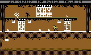Bruce had two means of dealing with them: a standing punch, which was weak and lacked for range and was thus useless, and the far-more-effective running jump kick, two or three of which could kill either enemy. Thanks to the latter, one enemy, alone, wasn't much of a threat. Though, when both were onscreen at the same time--and they usually were--things could get dicey.